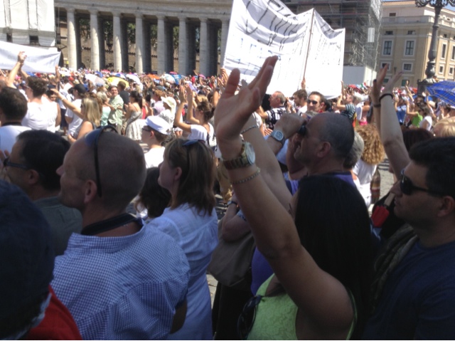 At last at midday, the Pope emerged at the second window from the right on the top floor of the building at the right of the square. It was great to see him. During the entire 15 minute address, in which we could also see him on big screens, he spoke only in Italian. I identified only a few words. 'Questo' and 'quello' he said a lot ('this' and 'that'). The Pope said 'desidera' a few times, meaning to want or desire. He said 'tutti noi' and 'tutti voi' ('all of us', and 'all of you'). He also said 'tutti nazione' ('all nations'). Then, after he clearly said 'Ramadan', which ended a few days ago, I understood him to talk of Christians and Muslims. I believe he said we should all live together in peace. I also felt the Pope was greeting particular groups in the crowd because off to the left a small number of people would cheer and shout. A moment later, off to the right, the same again. Some groups raised banners with words of greeting to the Pontiff, calling him Francesco. ('Pope Francis' in Italian is 'Papa Francesco', which you see all around Rome on the post cards, tea towels, and calendars.) The Pope chanted some appropriate religious texts, and the crowd murmured appropriately back. As he parted, the Pope smiled, said some words and waved. The crowd reciprocated. We are not Catholics, but we were really pleased to have seen the Pope, and thought the experience well worth the wait.